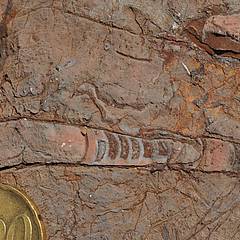 Detail vom Orthocerenstein; Einschwemmung kleinerer in größere Gehäusereste (Telescoping)